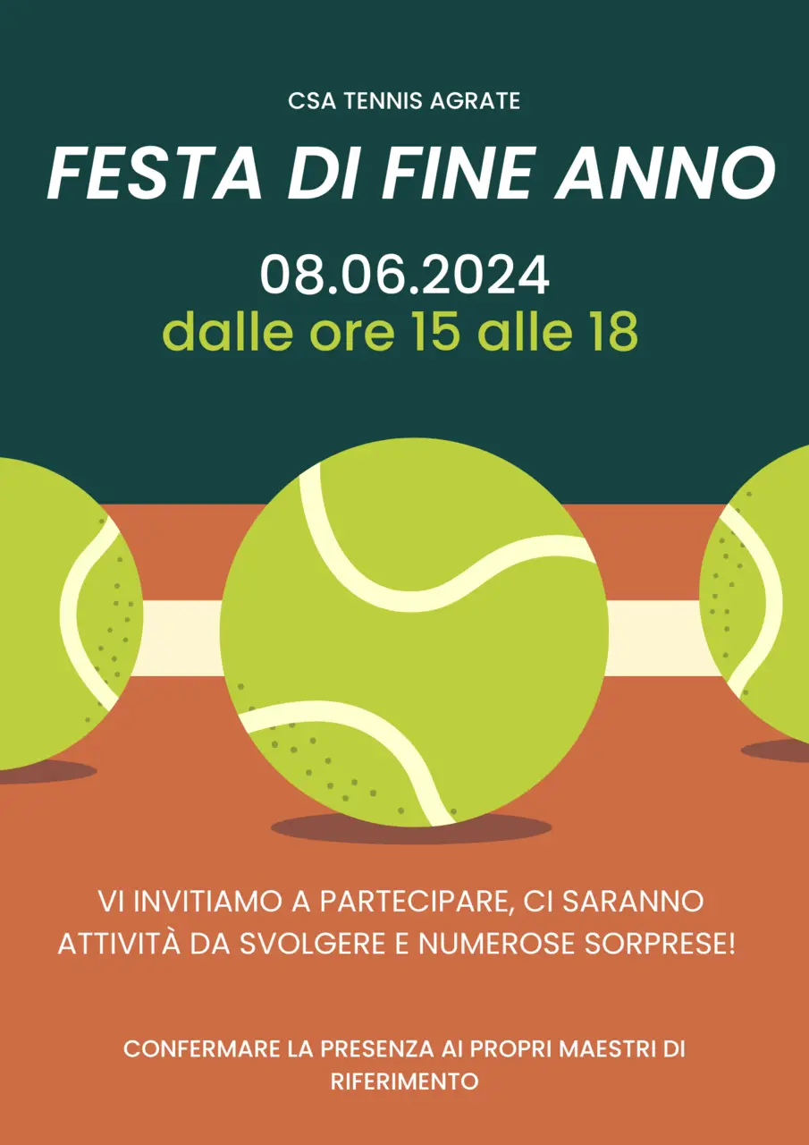 Sabato 8 giugno dalle ore 15.00 alle ore 18.00 circa, presso il CSA tennis Agrate, si terrà la festa di fine anno. Vi invitiamo a partecipare, ci saranno attività da svolgere e numerose sorprese.