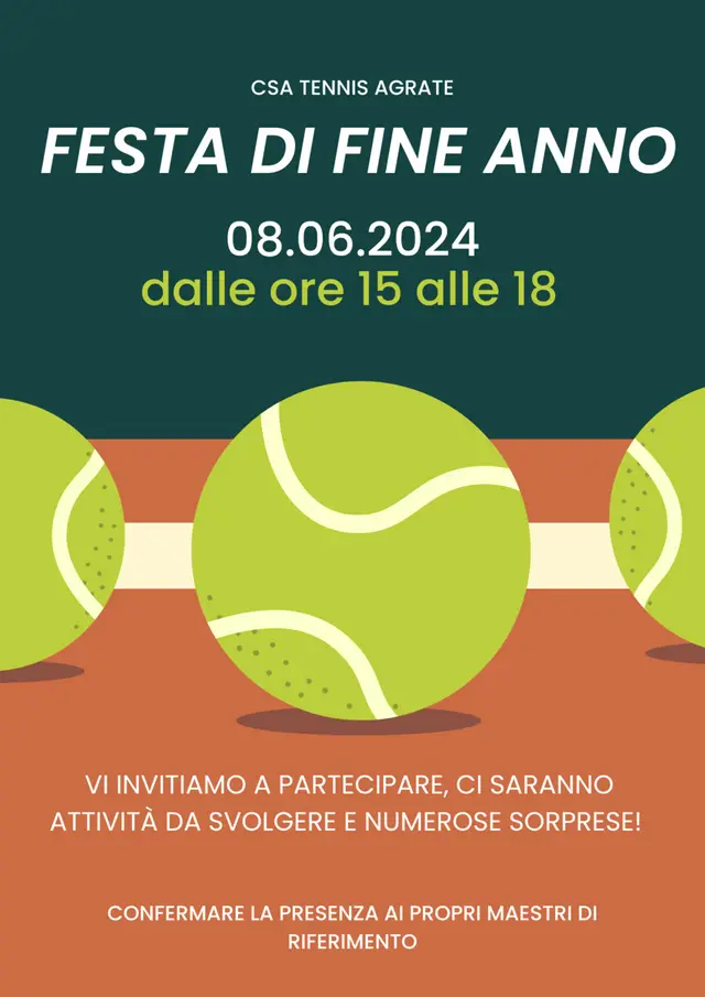 Sabato 8 giugno dalle ore 15.00 alle ore 18.00 circa, presso il CSA tennis Agrate, si terrà la festa di fine anno. Vi invitiamo a partecipare, ci...